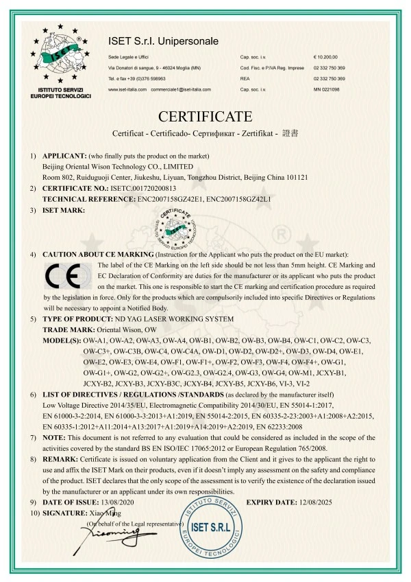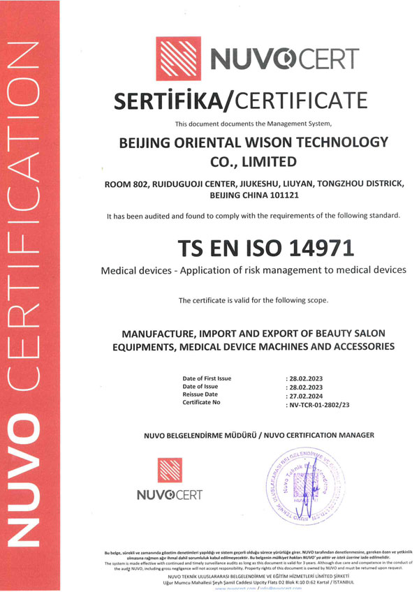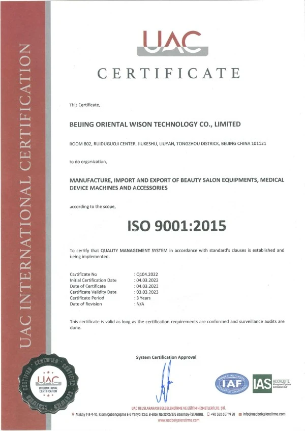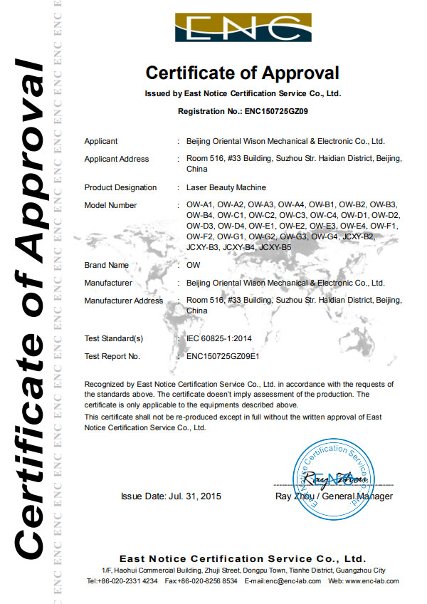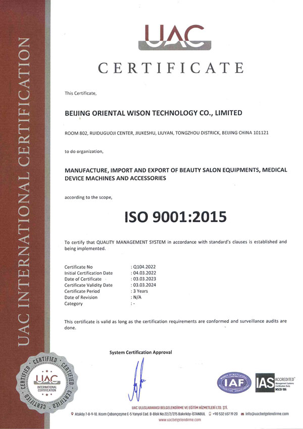 Beijing Oriental Wison Technology Co., LIMITED har været engageret inden for skønhedsudstyr siden 2002. Vi har oparbejdet et meget godt ry på verdensplan. Vi integrerer på forskning, udvikling, fremstilling, uddannelse, salg af skønhedslaser-skønhedsmaskiner. Vores produktlinje dækker Erbium yag laser, Alexandrite laser, diode laser, IPL Laser, ND YAG laser, 10600nm fraktioneret laser, RF mikronåle, EMS maskiner. Vi vil også levere OEM-service stærke distributører fra forskellige lande. Vi har opnået europæisk CE-lægecertifikat, ISO13485: 2008 og ISO9001: 2008 internationalt kvalitetskontrolsystemcertifikat.